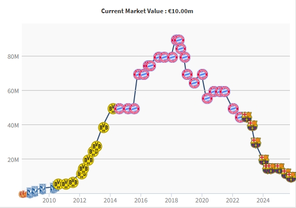 莱万的身价曾在2018年遵守拜仁时辰达到巅峰的9000万欧。