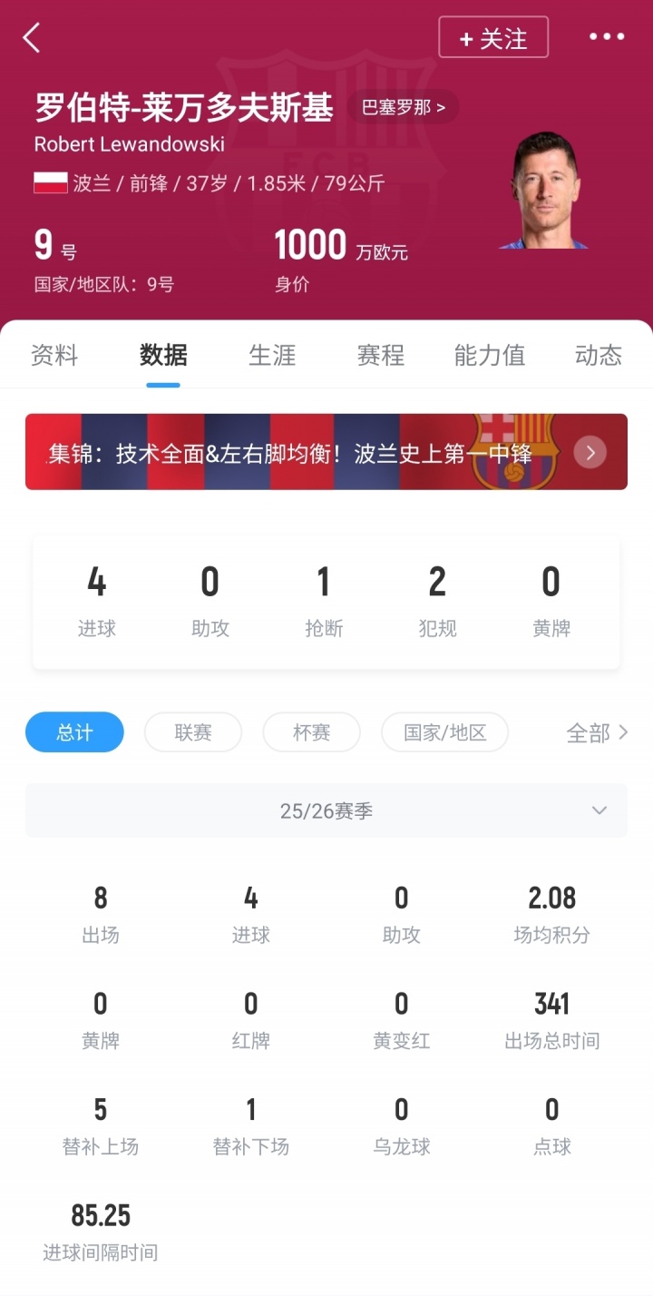 巅峰9000万!37岁莱万身价再跌200万至1000万欧 仍为同庚岁第一东说念主