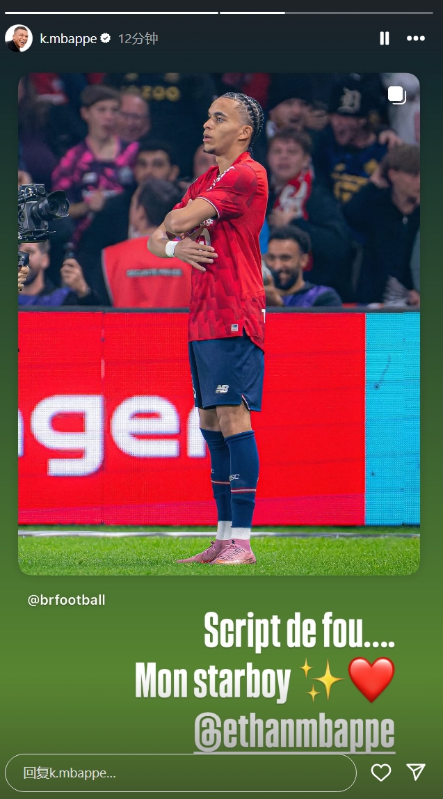 姆巴佩现场不雅看了这场比赛,见证弟弟绝平,他在酬酢媒体上晒出伊桑-姆巴佩的相片,配文:“豪恣的脚本,我的明星男孩。”