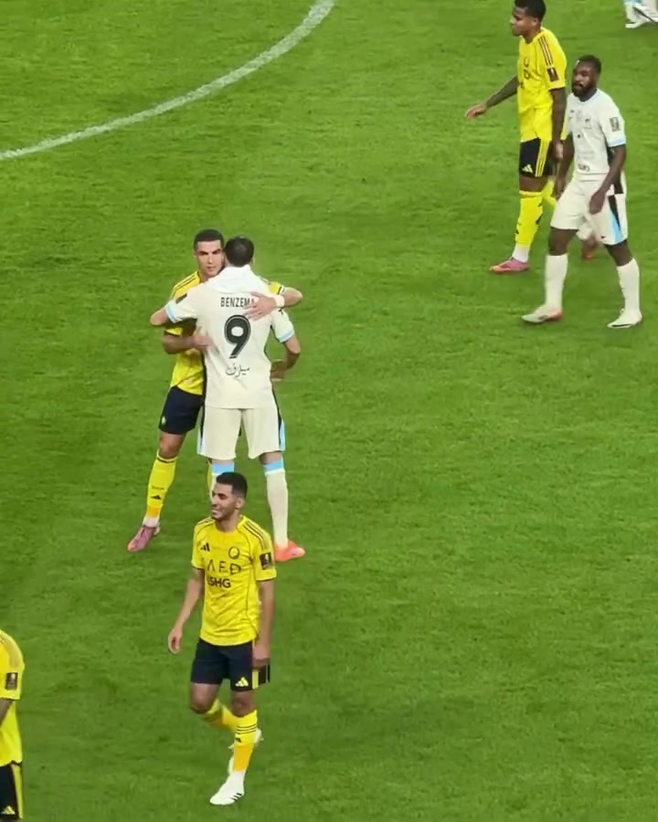 赛后C罗与本泽马拥抱问候,两东谈主曾在皇马并肩构兵342场比赛。