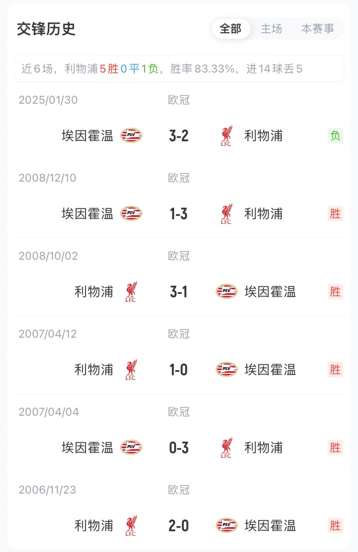 利物浦历史7次濒临埃因霍温仅输1次(5胜1平1负),且刚好是两边上一次对阵,利物浦客场2-3不敌埃因霍温。