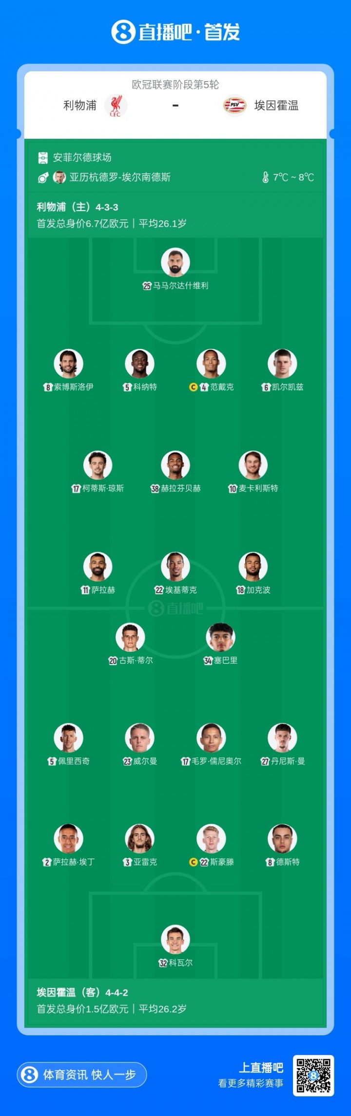利物浦欧冠3胜1负积9分暂居第10,联赛6胜6负积18分暂位英超第12,近期收货两连败;埃因霍温欧冠1胜2平1负积5分,联赛11胜1平1负积34分位居荷甲榜首,各项赛事已集中11场不败。