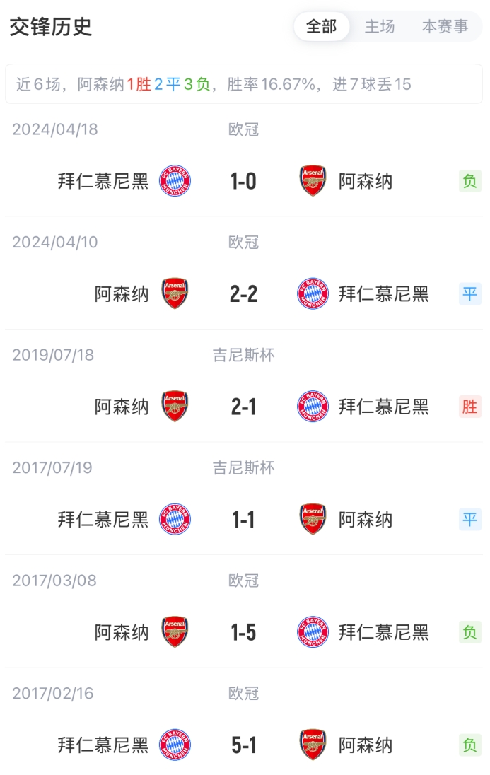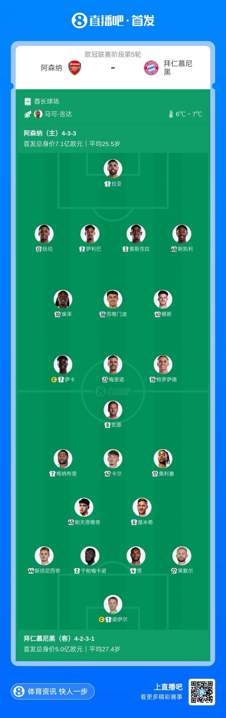 本场阿森纳方面加布里埃尔、约克雷斯、哈弗茨伤缺,拜仁方面迪亚斯停赛。