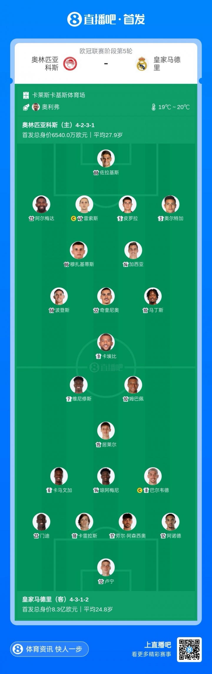 皇马vs奥林匹亚科斯:姆巴佩、维尼修斯先发,阿诺德、门迪出战