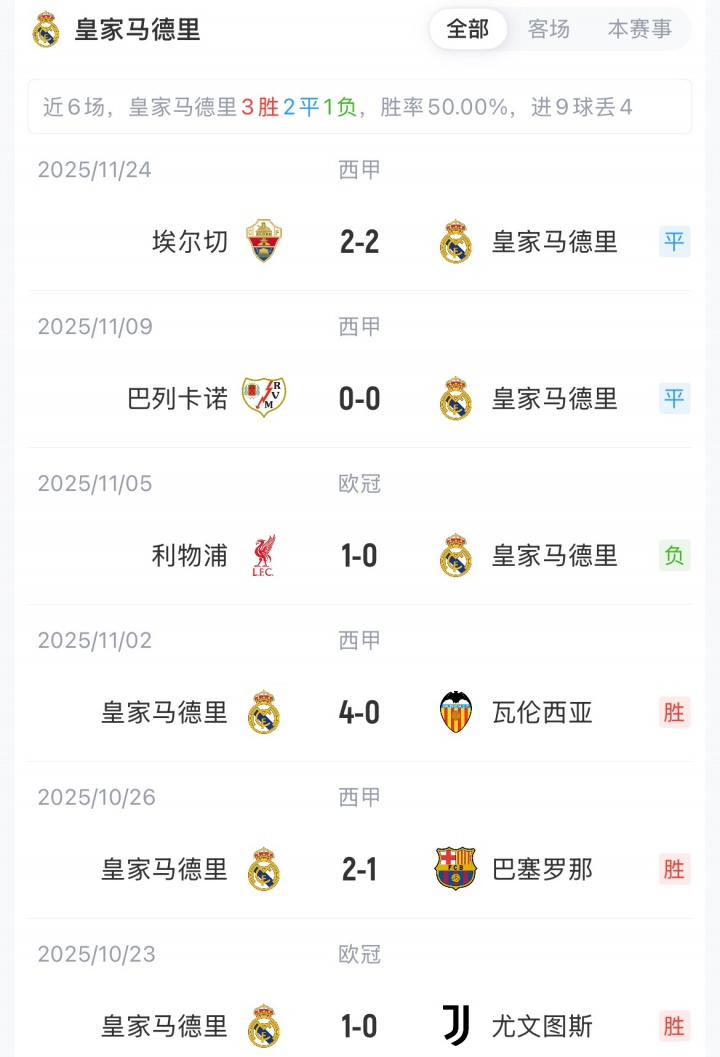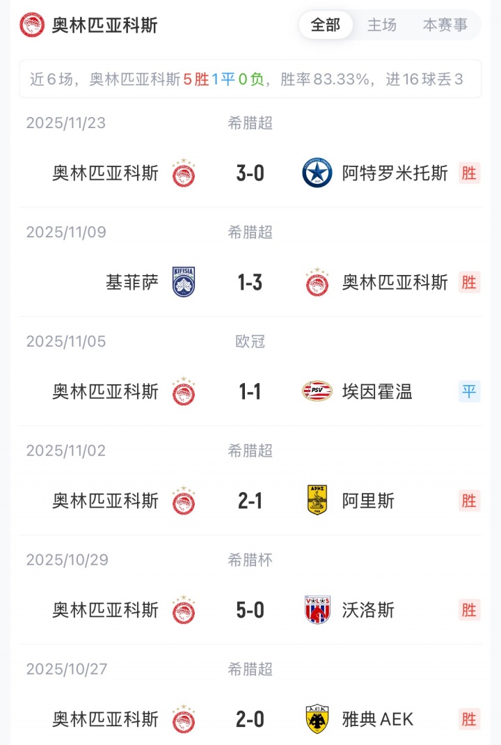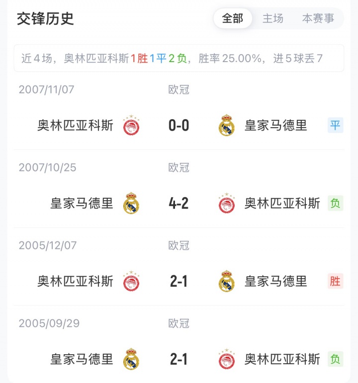 皇马欧冠3胜1负暂排第九,奥林匹亚科斯2平2负暂排第32名。