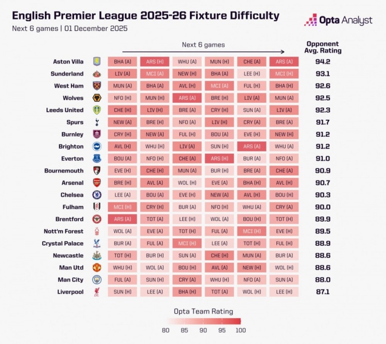 12月2日讯 opta分析了英超各队将来6轮的赛程难易进度,维拉赛程最为繁重,利物浦最容易。曼城第二容易,曼联比肩第三容易。