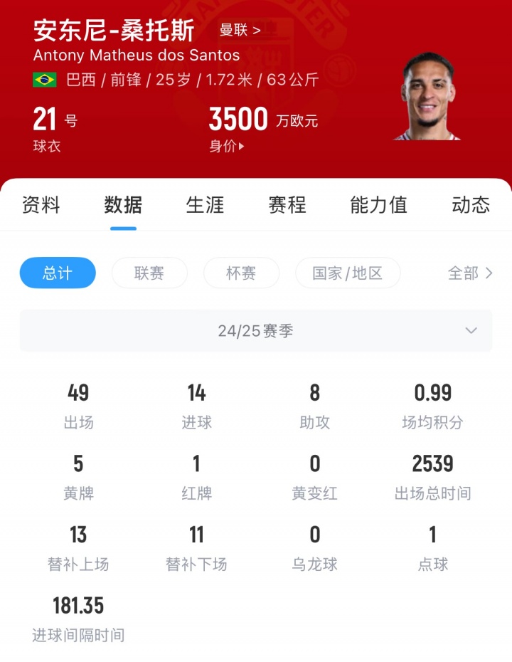 安东尼上赛季各赛事共出战49场,打进14球助攻8次。租出贝蒂斯手艺,安东尼屡次示爱贝蒂斯,抒发留住意愿。