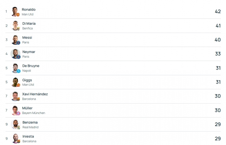 德布劳内面前欧冠助攻31记,与吉格斯比肩第五,C罗、迪马利亚、梅西前三。