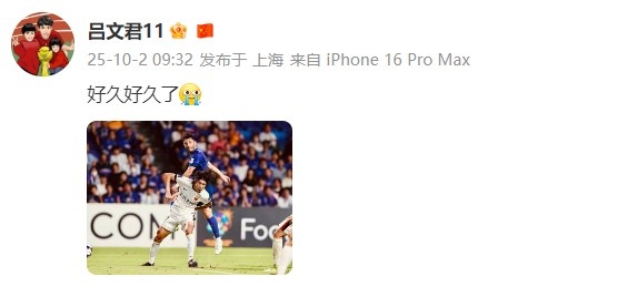 本场比赛海港宿将吕文君在第64分钟替补登场。他赛后更新了个东说念主社媒,晒出本场比赛照并写说念:“好久好深切。”