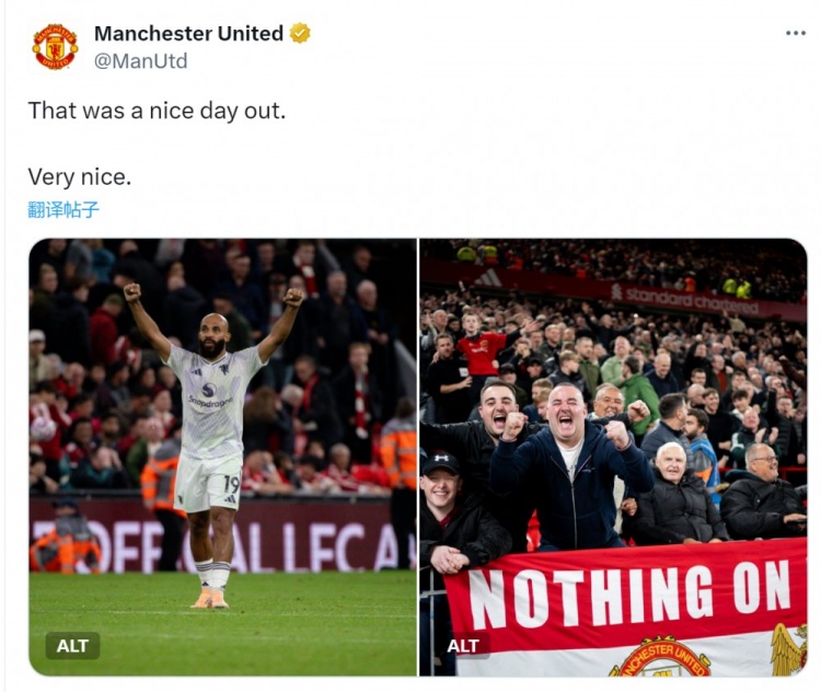攻陷安菲尔德!曼联官方社媒庆祝生效:精巧的客场之旅