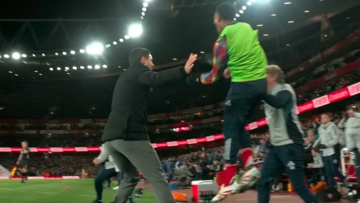 当埃泽第76分钟破门,演出帽子戏法匡助阿森纳4-1卓绝热刺时,原来在热身的斯凯利冲向教学席高高跃起振臂欣忭,随后他和阿尔特塔为首的教学组相拥庆祝,替补席上的多名队员随后也加入庆祝。