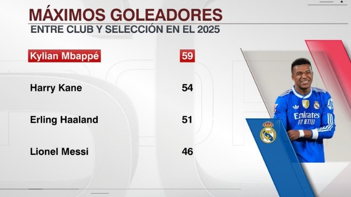 足坛2025年进球榜:姆巴佩59球居首,凯恩、哈兰德、梅西紧随后来