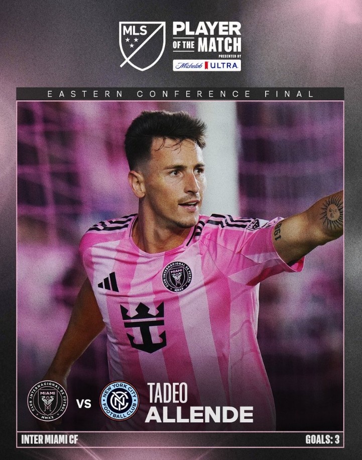 献技帽子戏法,好意思职联官方:阿连德当选迈阿密5-1纽约城全场最好