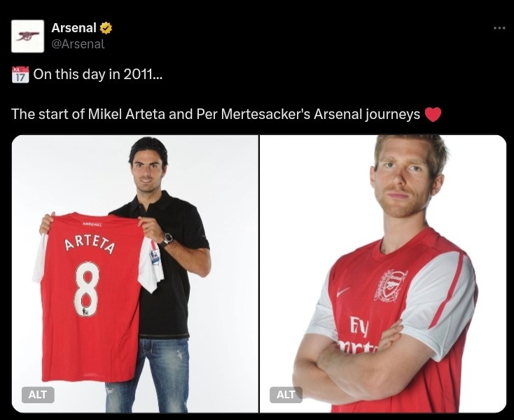 阿森纳官推晒照:2011年的今天,阿尔特塔&默特萨克开启枪手活命