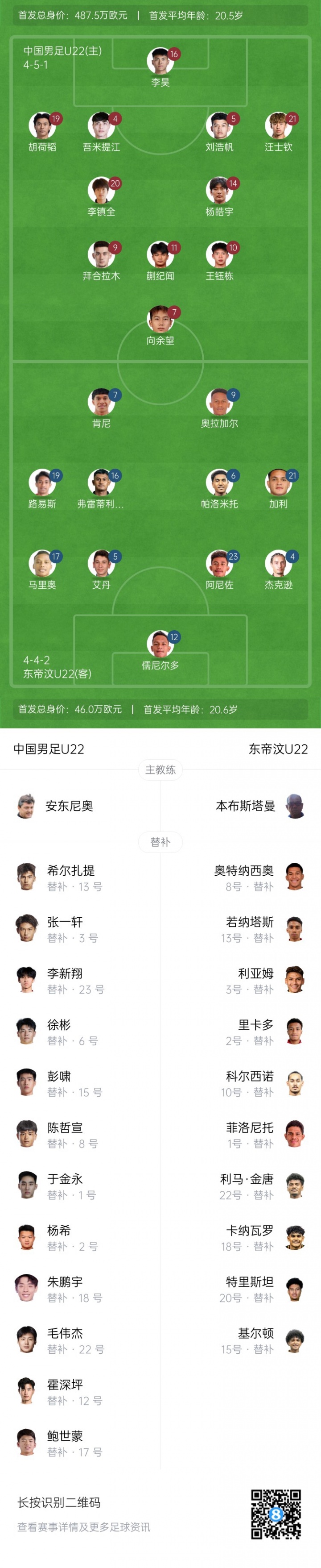 U22国足vs东帝汶首发:王钰栋、蒯纪闻先发 向余望、拜合拉木出战