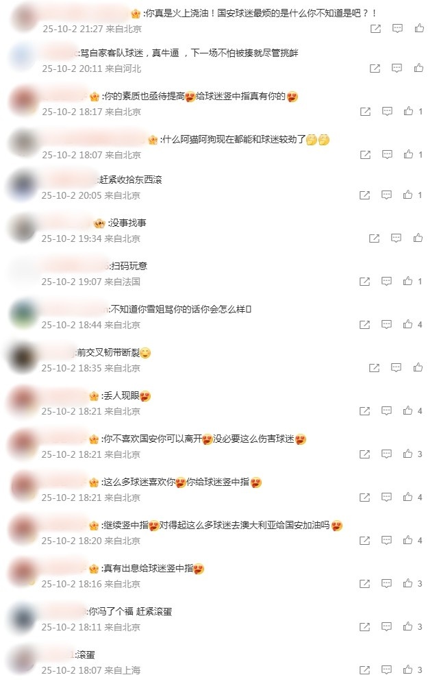 相关新闻——又与球迷冲破!国安球迷赛后集体痛骂杨立瑜,球员比手势饱读掌回答