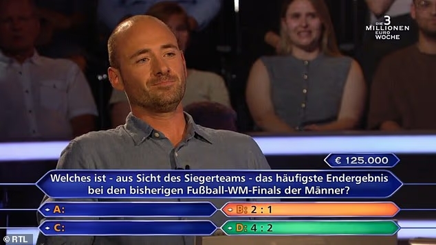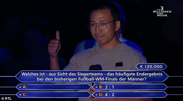 10月11日讯 在德国版的《谁思成为百万大亨》材干竞赛节目中,一位参赛者没能回话对寰宇杯决赛的比分,错失12.5万欧元(约103万东说念主民币)奖金。