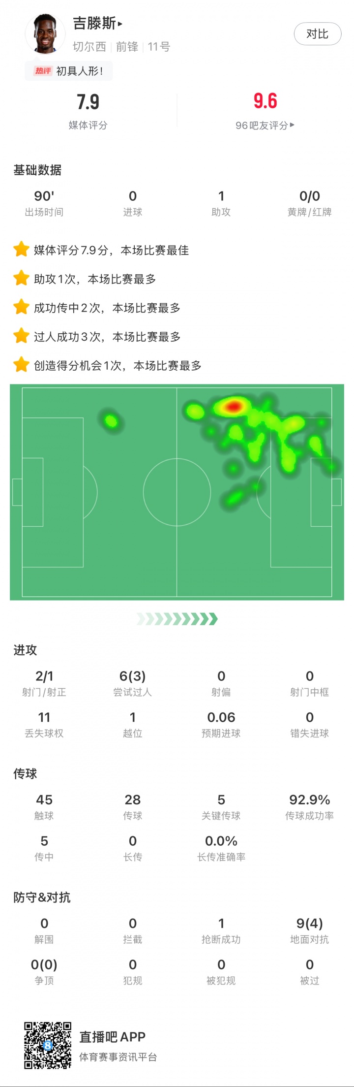 本场比赛,吉滕斯2次射门1次射正,6次尝试过东说念主3次到手,28次传球26次到手,传球到手率92.9%,5次关键传球,创造1次良机,得益1次助攻,获评7.9分全场最高,当选欧冠官方评比的MVP。