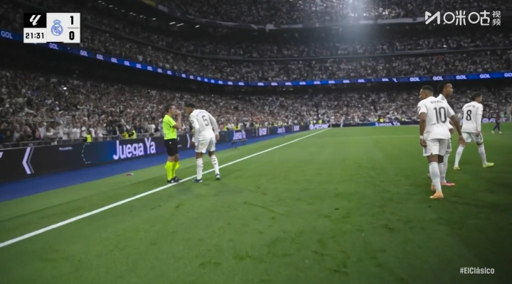 10月26日讯 西甲第10轮,皇马vs巴萨,比赛第22分钟,贝林厄姆直塞,姆巴佩单刀破门,进球后贝林厄姆找到边裁说了些什么,边裁则通告了“🤏”手势。
