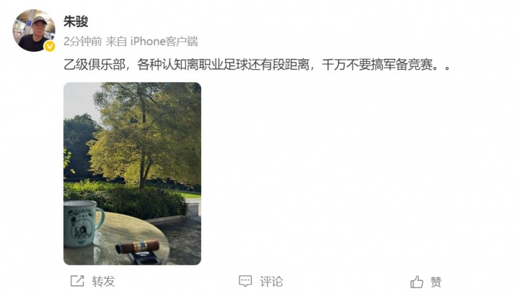 今天,朱骏在个东说念主微博晒照,他同期配文:乙级俱乐部,各式瓦解下野业足球还有段距离,千万不要搞武备竞赛。。
