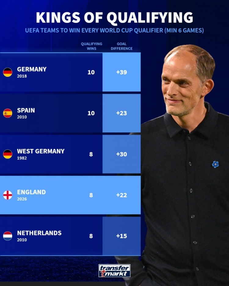 德国转会商场清点了单届欧洲世初赛全胜球队,德国、西班牙、英格兰、荷兰在列。