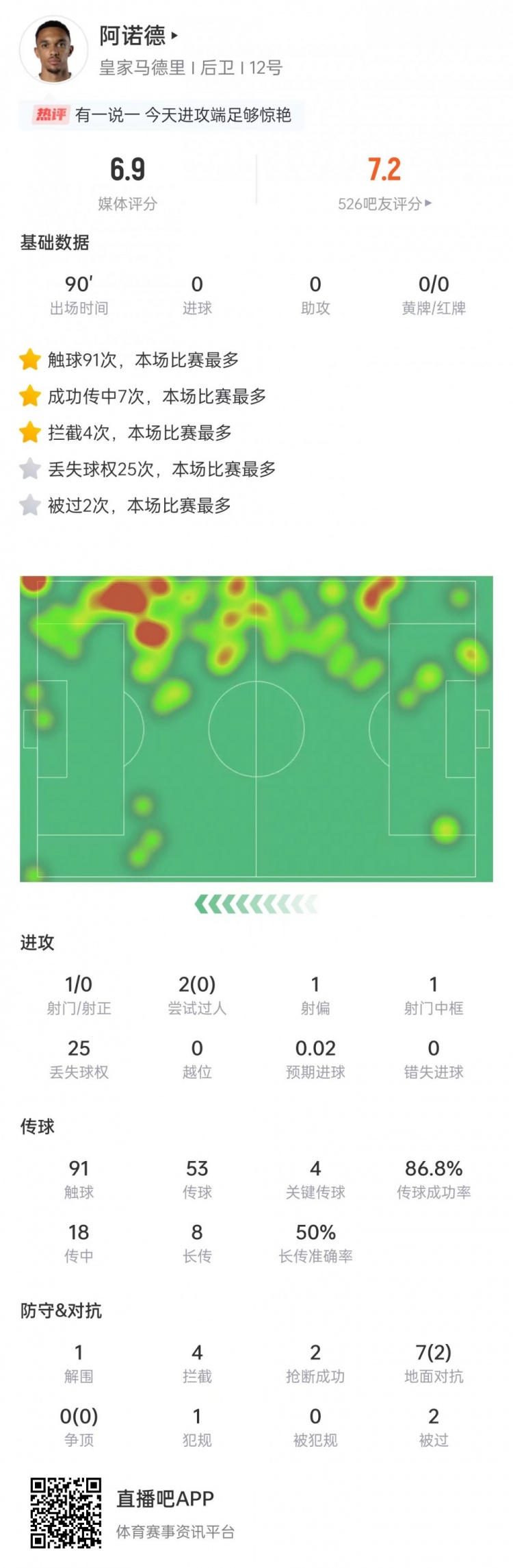 阿诺德本场触球91次、传中得胜7次、丢球权25次,均为全场最多