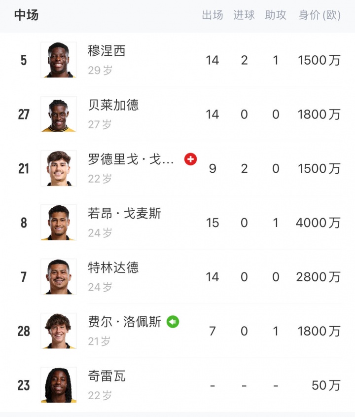 效率梯队or外租?狼队中场6东说念主身价超千万,1东说念主身价50万但0出场