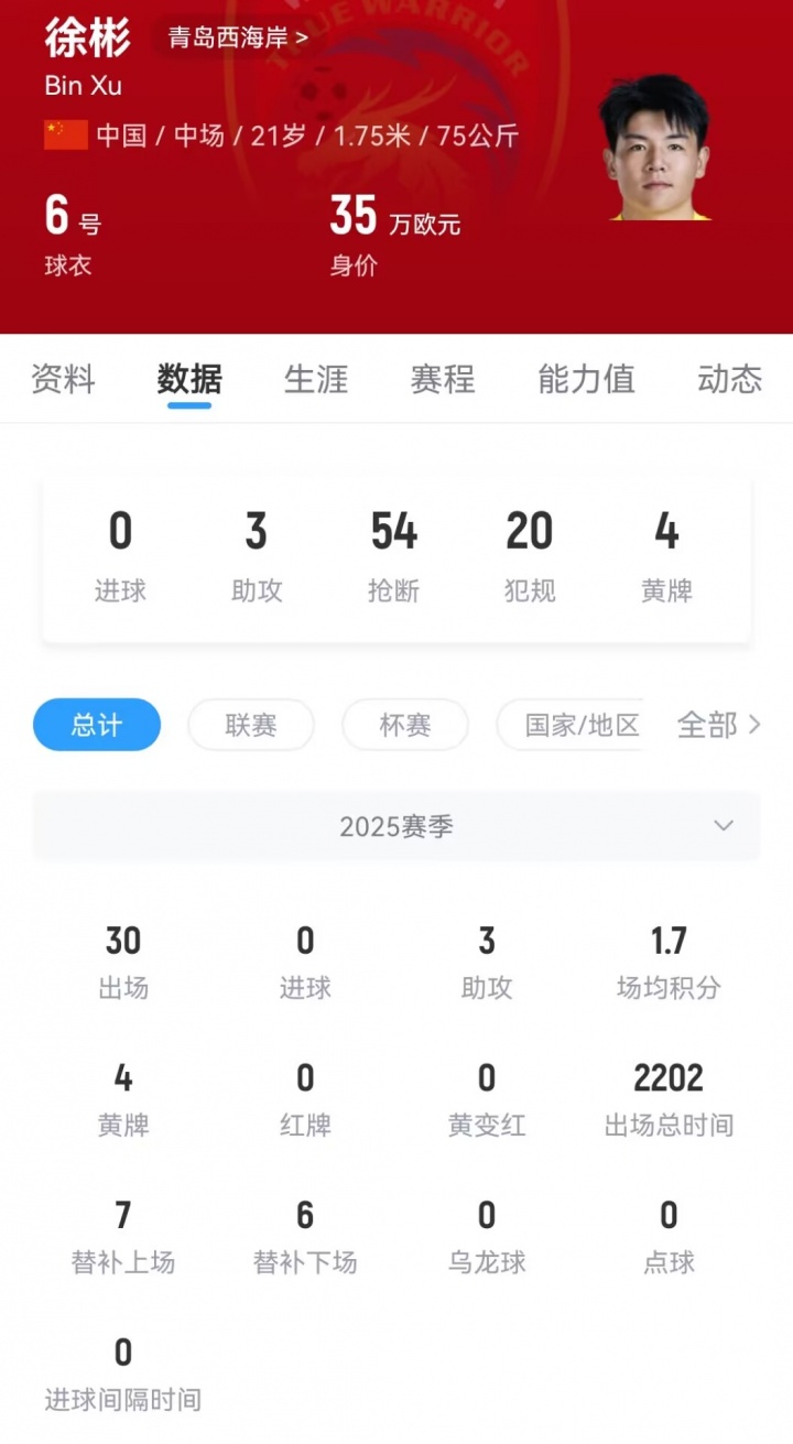 徐彬现年21岁,司职后腰,现身价35万欧。
