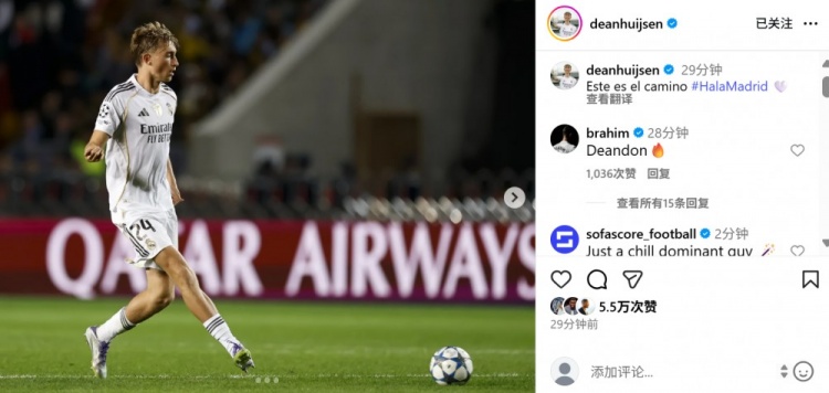 本场比赛皇马后卫赫伊森首发,赛后他也在社媒晒照庆祝告捷,写谈:“就所以这么的表情见效,皇马加油!”