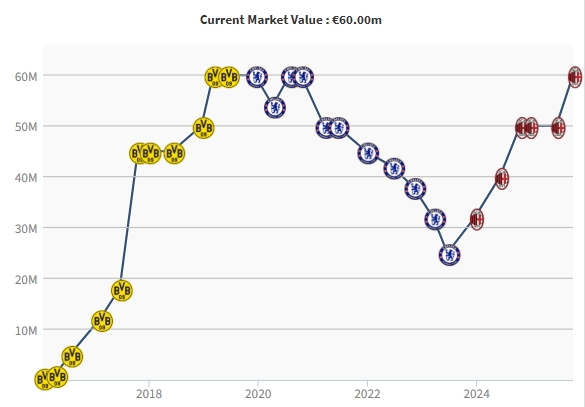 普利西奇曾在2019、2020年效能多特和切尔西本领身价达到6000万欧,而后沿途下降至2500万欧。