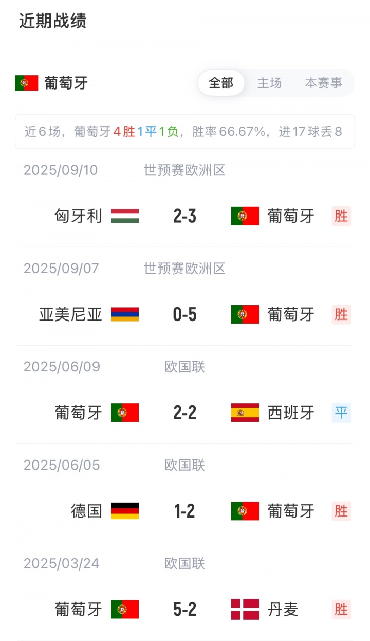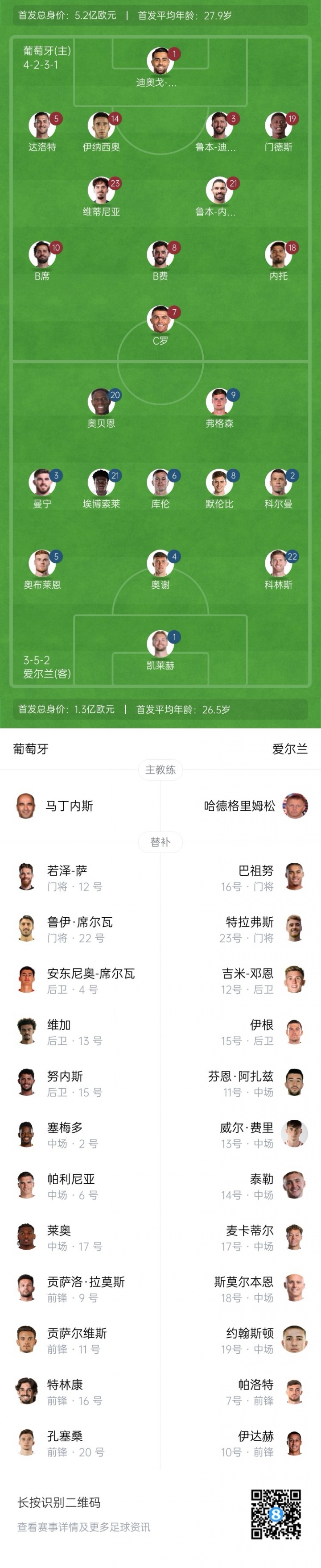 葡萄牙首发:1-迪奥戈·科斯塔、3-鲁本·迪亚斯、5-达洛特、7-C罗、8-B费、10-B席、14-伊纳西奥、18-内托、19-努诺·门德斯、21-鲁本·内维斯、23-维蒂尼亚