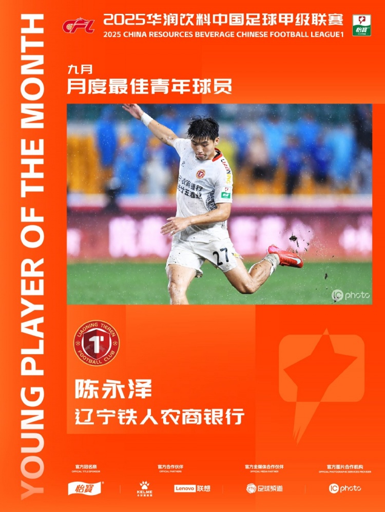 中甲官方:辽宁铁东谈主球员陈永泽获9月最好后生球员,斩1球1助攻