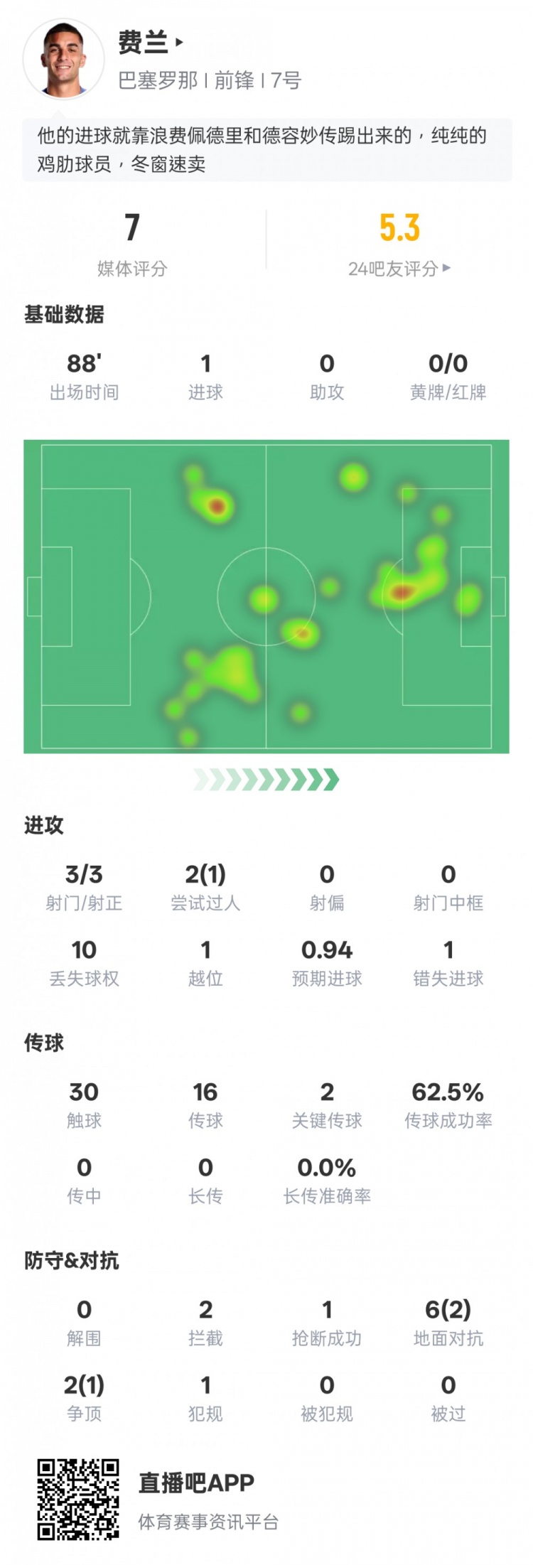 11月3日讯 西甲第11轮,巴萨主场迎战埃尔切,费兰-托雷斯首发出战,孝敬1粒进球,送出2次关节传球,1次过东谈主顺利,1次错失进球契机,评分7.0。