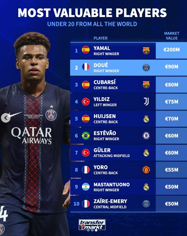 11月5日讯 杜埃荣膺2025年金童奖,德转也清点了足坛U20球员身价榜,具体如下:
