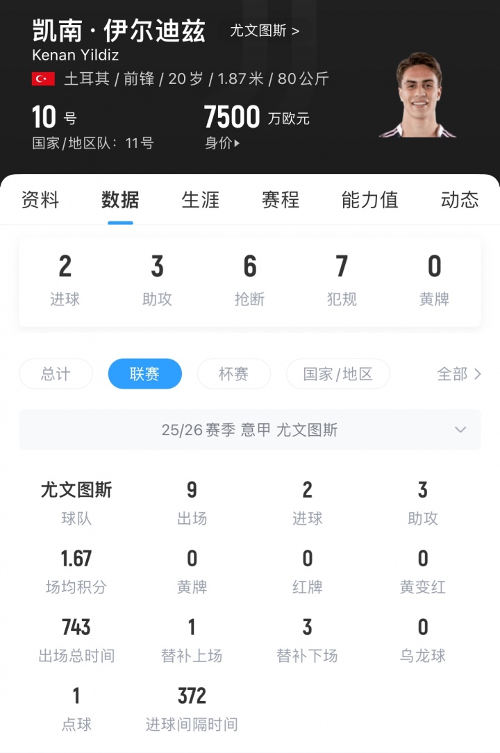 伊尔迪兹现年20岁,司职左边锋,当今球员德转估值7500万欧,与尤文现存协议在2029年到期。本赛季,伊尔迪兹为尤文出战13场比赛,孝敬3球4助。