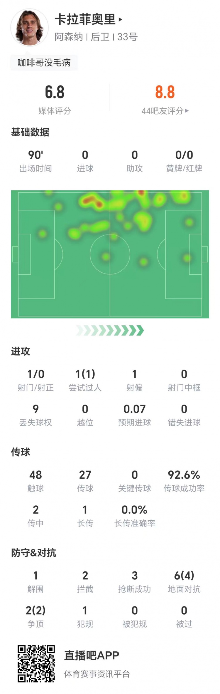 卡拉菲奥里全场数据:1次突围,两次防止,3次抢断,获评6.8分