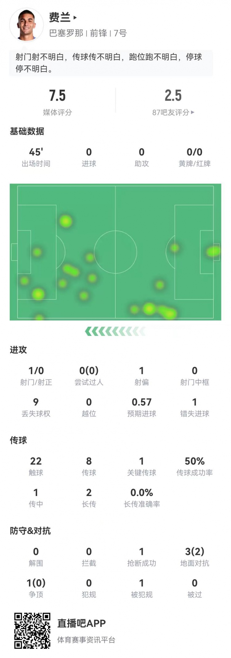 认可吗?费兰本场1射1失良机1要津传球 4招架2奏凯 7.5分全队最高