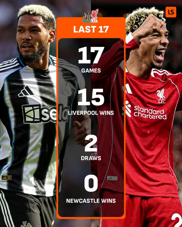 据媒体统计,利物浦近17次英超对阵纽卡保握不败,战绩15胜2平。