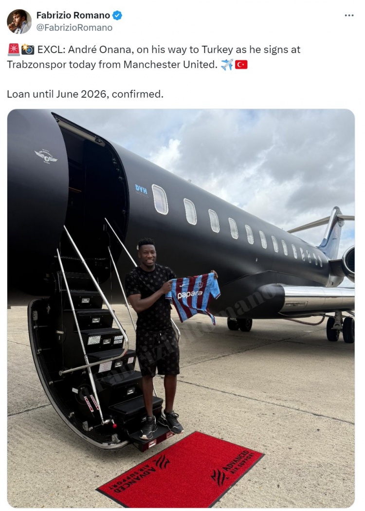 罗马诺流露,曼联门将奥纳纳正在赶赴土耳其的路上,他将在今天与特拉布宗体育签约,租赁加盟这家土超俱乐部,租赁期限到2026年6月。